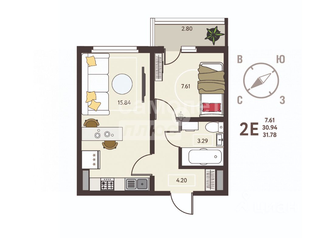 Общая площадь 31.78 м² черновая отделка.