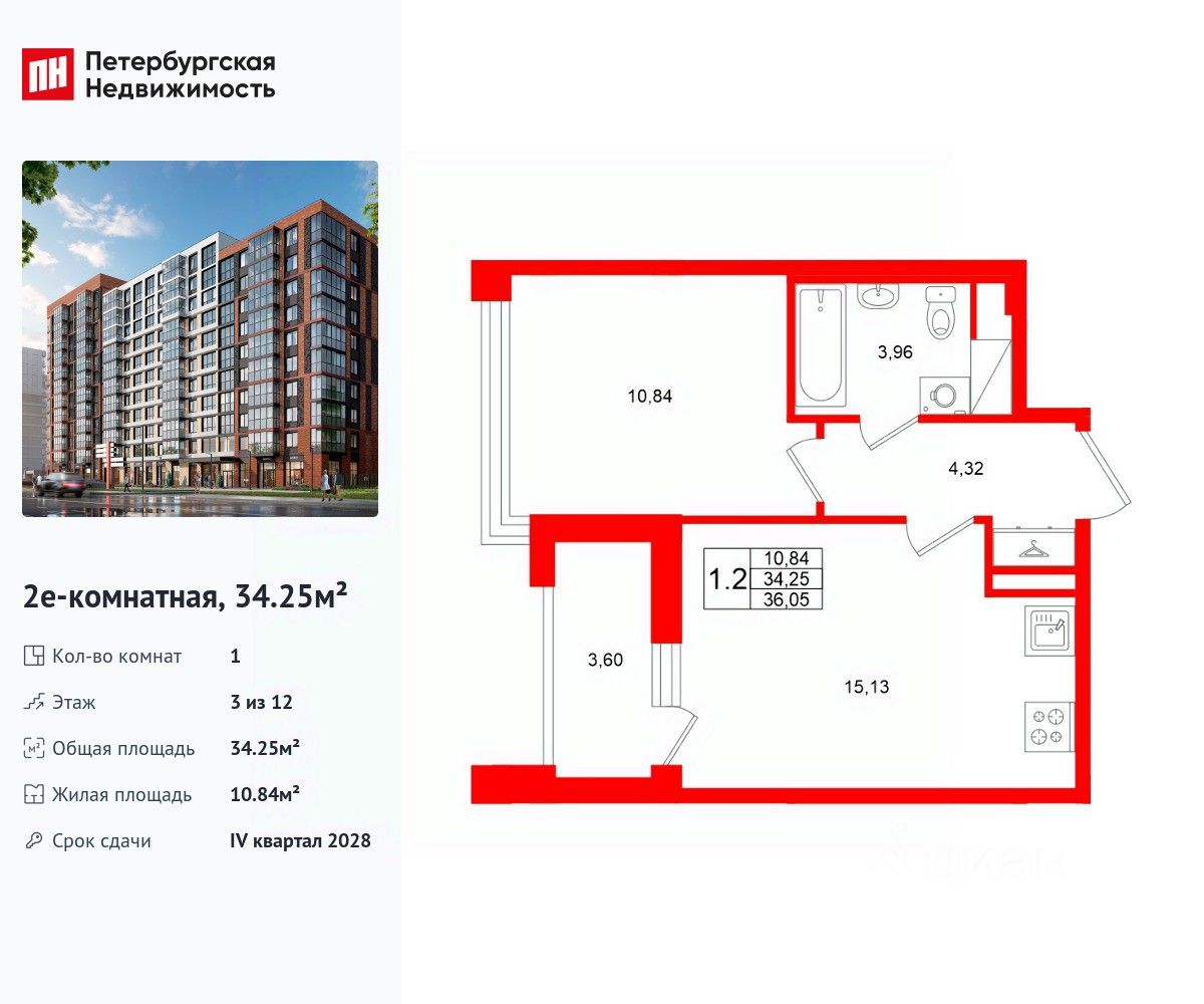 Удобная, классическая, функциональная европланировка, большая кухня-гостиная 15.13 м², просторная прихожая 4.32 м². Общая площадь квартиры - 34.25 м², жилая 10.84 м², высота потолка 2.77 м.