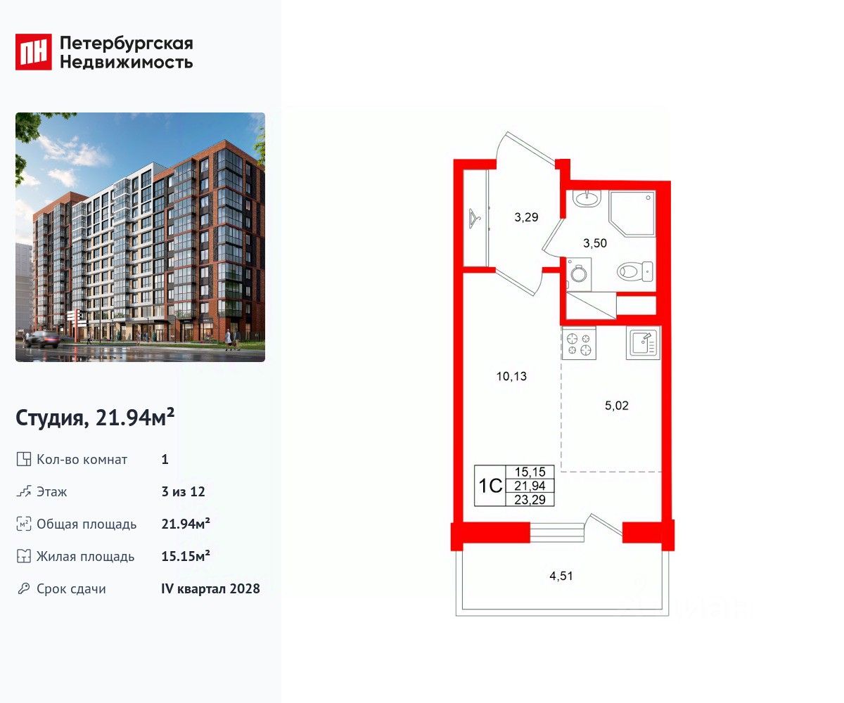 Удобная, классическая, функциональная европланировка, просторная прихожая 3.29 м². Общая площадь студии - 21.94 м², жилая 15.15 м², высота потолка 2.77 м.