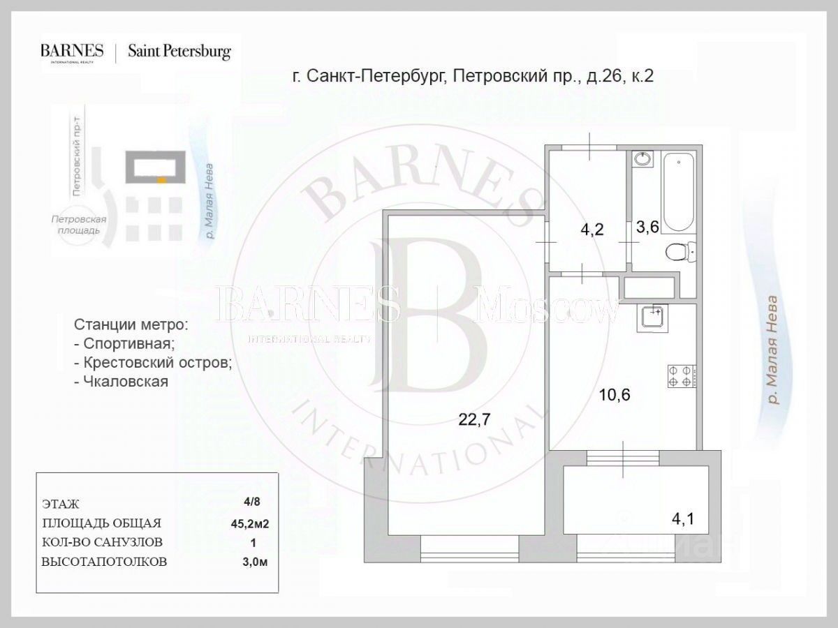 1к.квартира с просторной комнатой площадью 22,7 м² позволяет легко зонировать пространство под реальные задачи — сон, работу, жизнь. Кухня с выходом на просторную лоджию. Широкие и панорамные окна, потолки высотой 3 метра добавляют объём пространству.В квартире индивидуальная система вентиляции и система фильтрация воды. Архитектурный проект жилого комплекса разработан мастерской Евгения Герасимова и партнерами — имя, которое в Петербурге обычно не требует пояснений. Дом выделяется выразительной архитектурой: фасады облицованы натуральным камнем и керамогранитом, входные группы — современные, с автоматическими дверьми. Зона ресепшен с круглосуточным консьержем и общественная зона с панорамными витражными окнами и художественной подсветкой. На территории комплекса предусмотрены зона отдыха и детская площадка, а выход к набережной организован через террасу-солярий — прекрасная роскошь для жильцов дома. Расположение удачно сочетает приватность и городскую логику: Крестовский остров — около 10 минут пешком, центр Петроградской стороны — 5 минут. Жилой комплекс The One расположен в сердце Петровского острова, на берегу Малой Невы, в наиболее уединённой части исторического Петроградского района. Окружение формируют исключительно объекты высокого класса, что создаёт спокойную и однородную социальную среду.