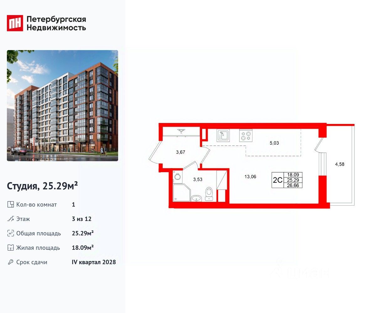 Удобная, классическая, функциональная европланировка, просторная прихожая 3.67 м². Общая площадь студии - 25.29 м², жилая 18.09 м², высота потолка 2.77 м.