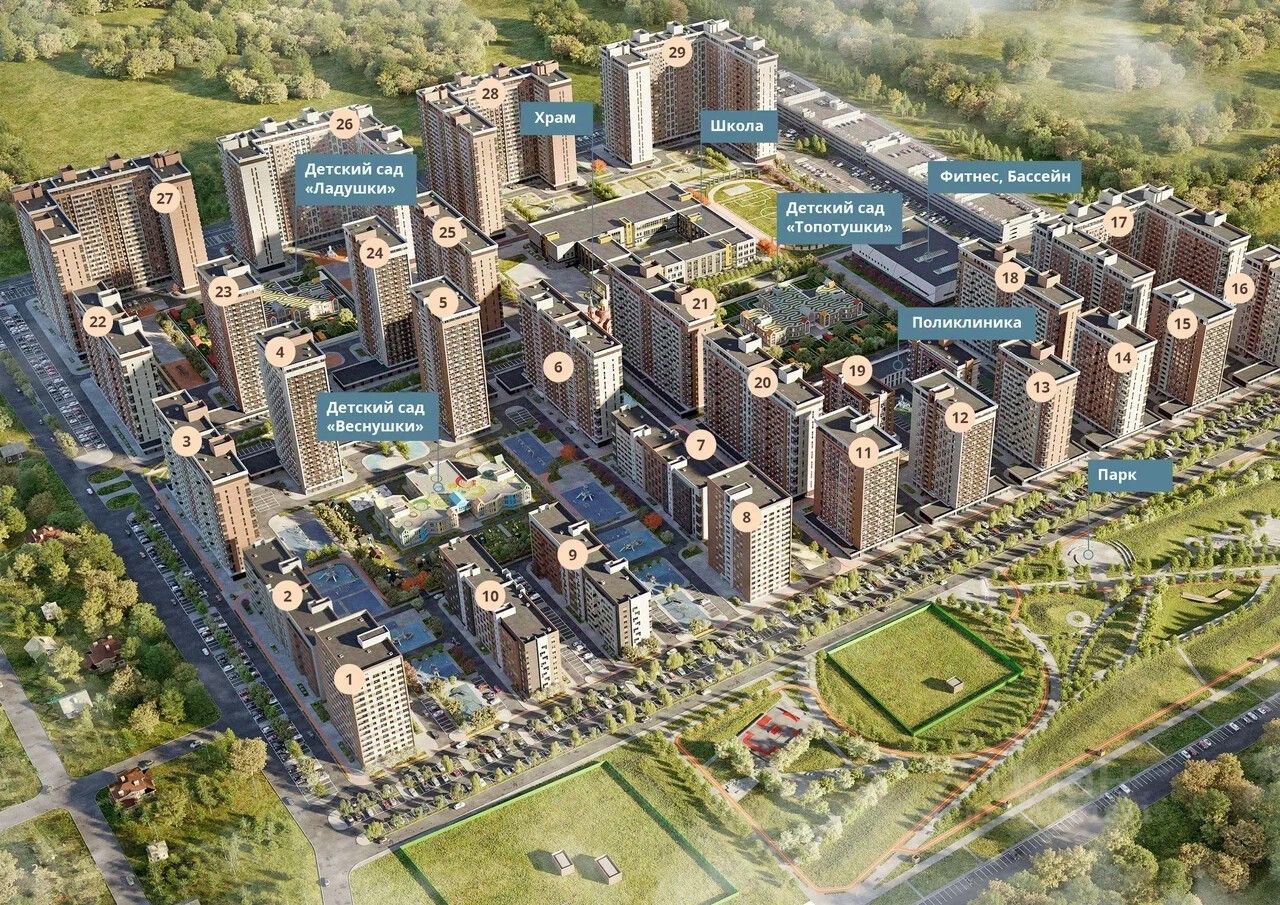 Крутая комплексная застройка территории с развитой инфраструктурой - на территории комплекса расположены школа на 1550 мест, 3 детских сада на 800 мест, поликлиника и частные клиники. На первых этажах домов расположены коммерческие помещения.