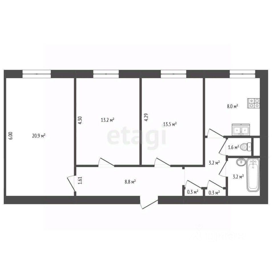 Комнат: 3 изолированные комнаты площадью 13,2 + 13,5 + 20,9 кв.м Окна выходят на юго-восток, благодаря чему в помещение проникает достаточное количество солнечного света, однако чрезмерного перегрева не наблюдается