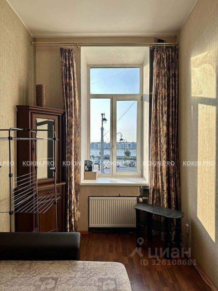 О Комнате: Комната 18 кв. М. Прямоугольной формы. Высота потолков 3.2м. Окно выходит на реку Нева и Петровский стадион. В комнате сделан ремонт (Установлено пластиковое окно, ламинат на полу, стены выровнены и поклеены обои, установлена металическая входная дверь).