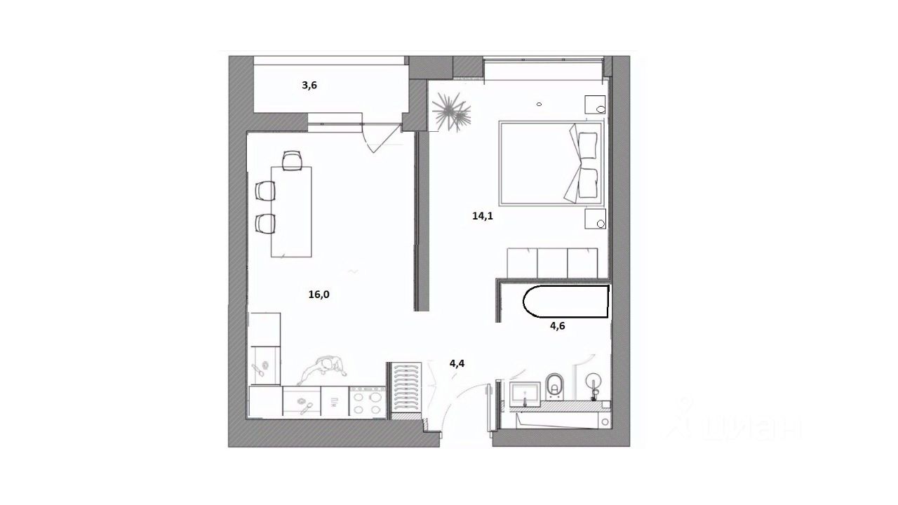 Можно сделать ремонт под себя из качественных материалов. Выполнена электроразводка с установкой розеток и выключателей, установлены входные двери. Большая кухня 16 кв.м. Просторная лоджия 3,6 кв.м. (в общий метраж не входит) позволяет устроить удобное место для отдыха или работы