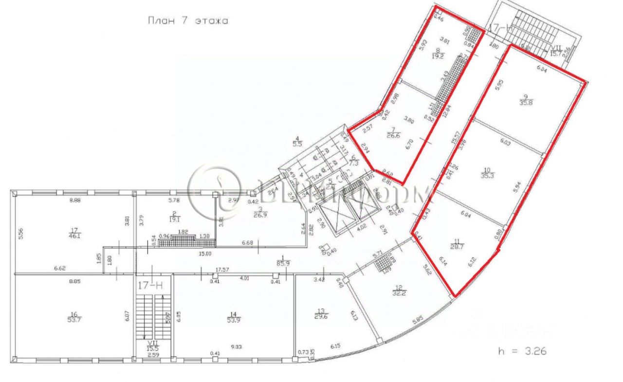 Находится на седьмом этаже. Кабинетная планировка из 5 смежных комнат.