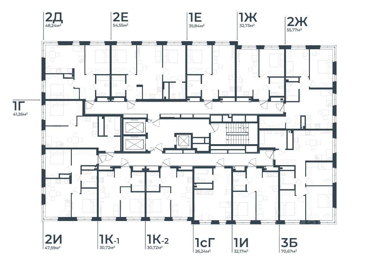- Кладовые помещения на каждом этаже и на -1 этаже. В проекте 25 планировочных решений: от уютных студий от 21,51 м² до квартир с тремя спальнями и кухней-гостиной до 66,58 м² с функциональным разделением на гостевую и приватные зоны.
