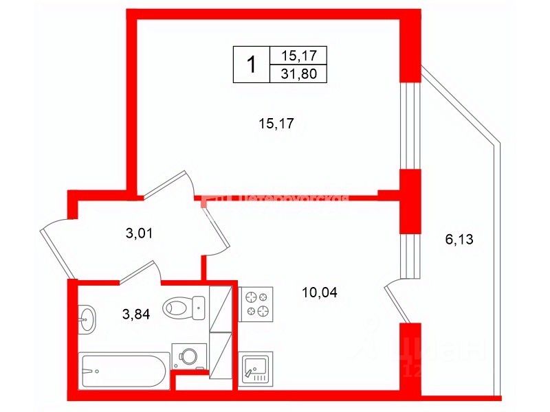 ПЛAНИРОBKА: Светлая изолированная комната 15 м, Просторная кухня 10 м, Совмещенный санузел: напольный унитаз и ванна, Большая застекленная лоджия 6 м, Квартира расположена на 9 этаже 13-этажного дома.