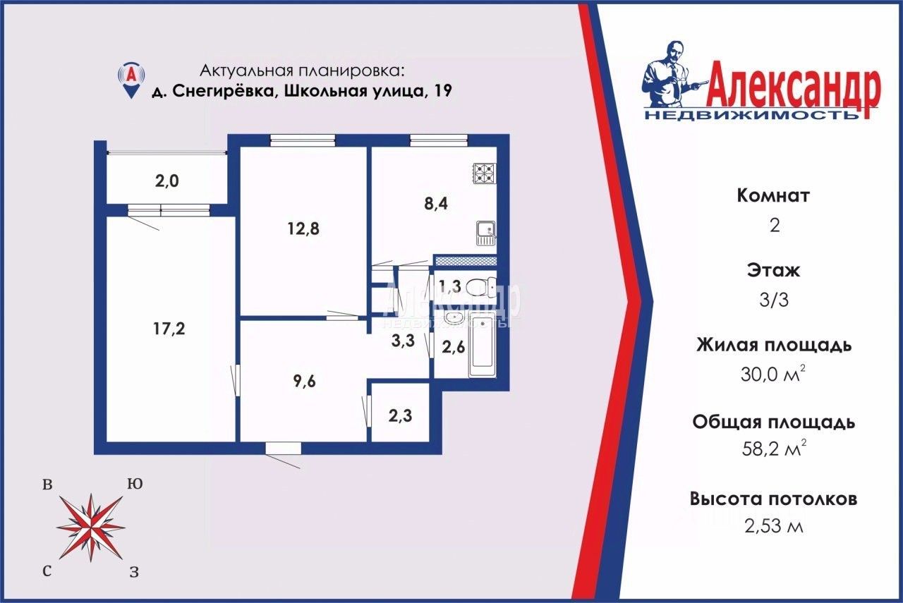 1686661 Предлагаем приобрести просторную двухкомнатную квартиру 58,2 кв.м. в д. Снегирёвка Приозерского района. Комнаты 17,2+12,8 кв.м., просторная кухня 8,4 кв.м., прихожая 9,6 кв.м., раздельный санузел. Квартира очень тёплая, не угловая. Требуется ремонт. Придомовая территория ухожена, есть парковка.