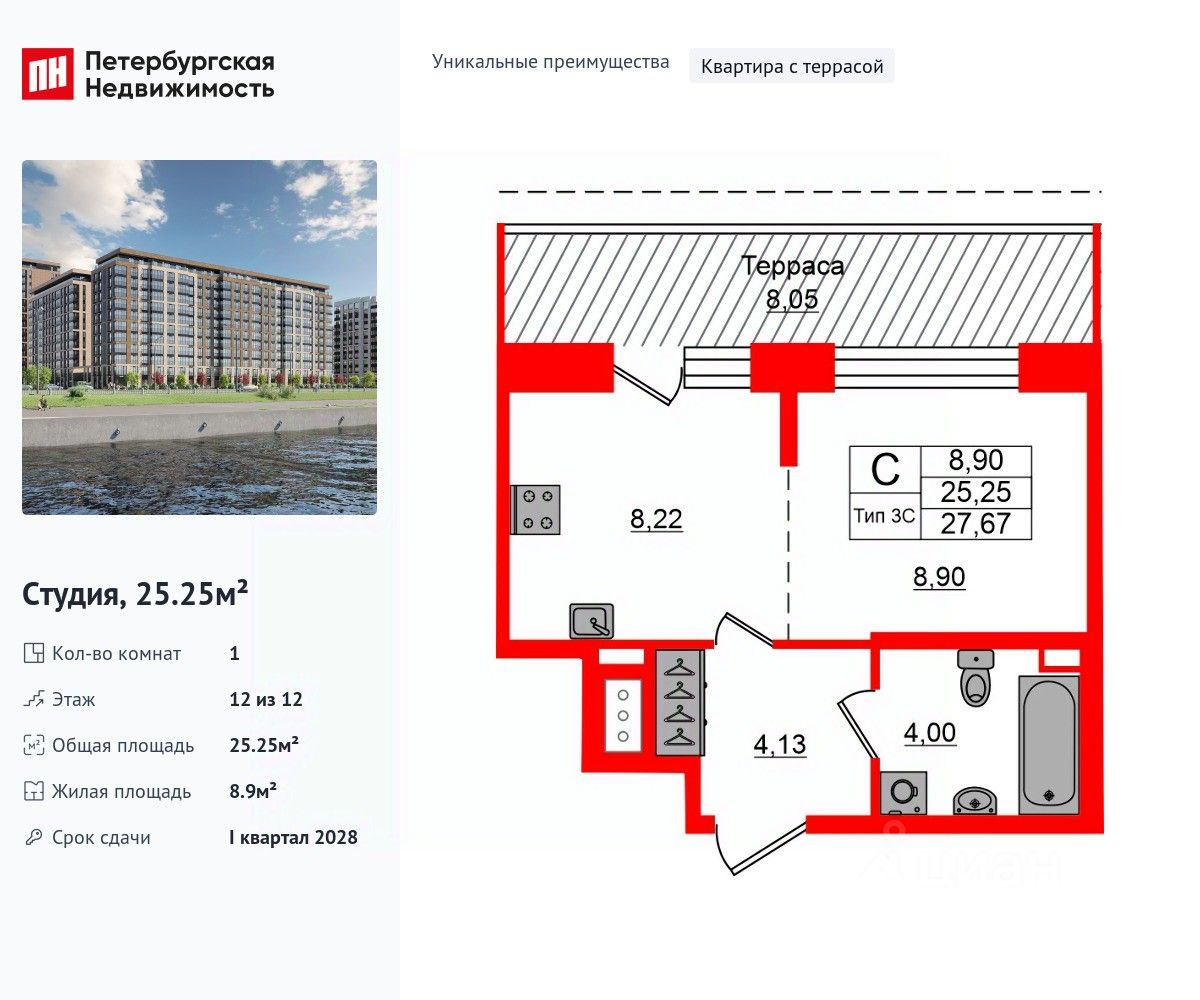 Уникальная, функциональная европланировка, просторная прихожая 4.13 м². Общая площадь студии - 25.25 м², жилая 8.9 м², высота потолка 3.04 м.