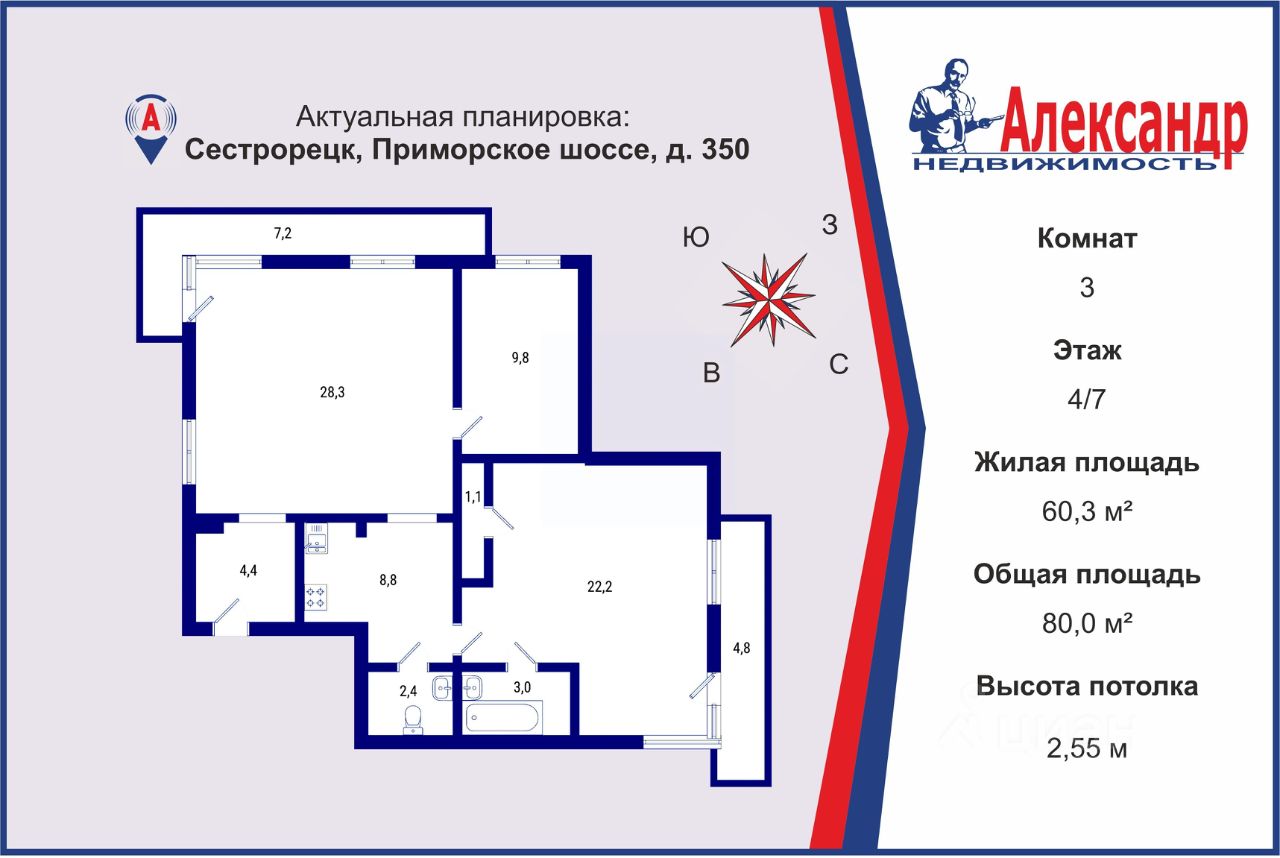 1700655 В прямой продаже большая 3-х комнатная квартира в 100 метрах от пляжа и ресторана '' Тайм Аут''. Гостиная (28 кв.м)с 3-мя окнами и выходом на лоджию, спальня 22 (кв.м) с лоджией, детская комната 10 (кв.м), кухня 9 (кв.м). Раздельный санузел.