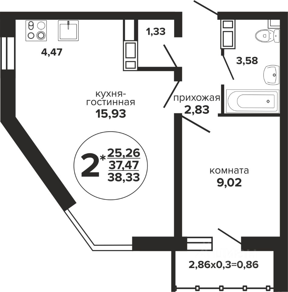 Общая площадь38,33 м2