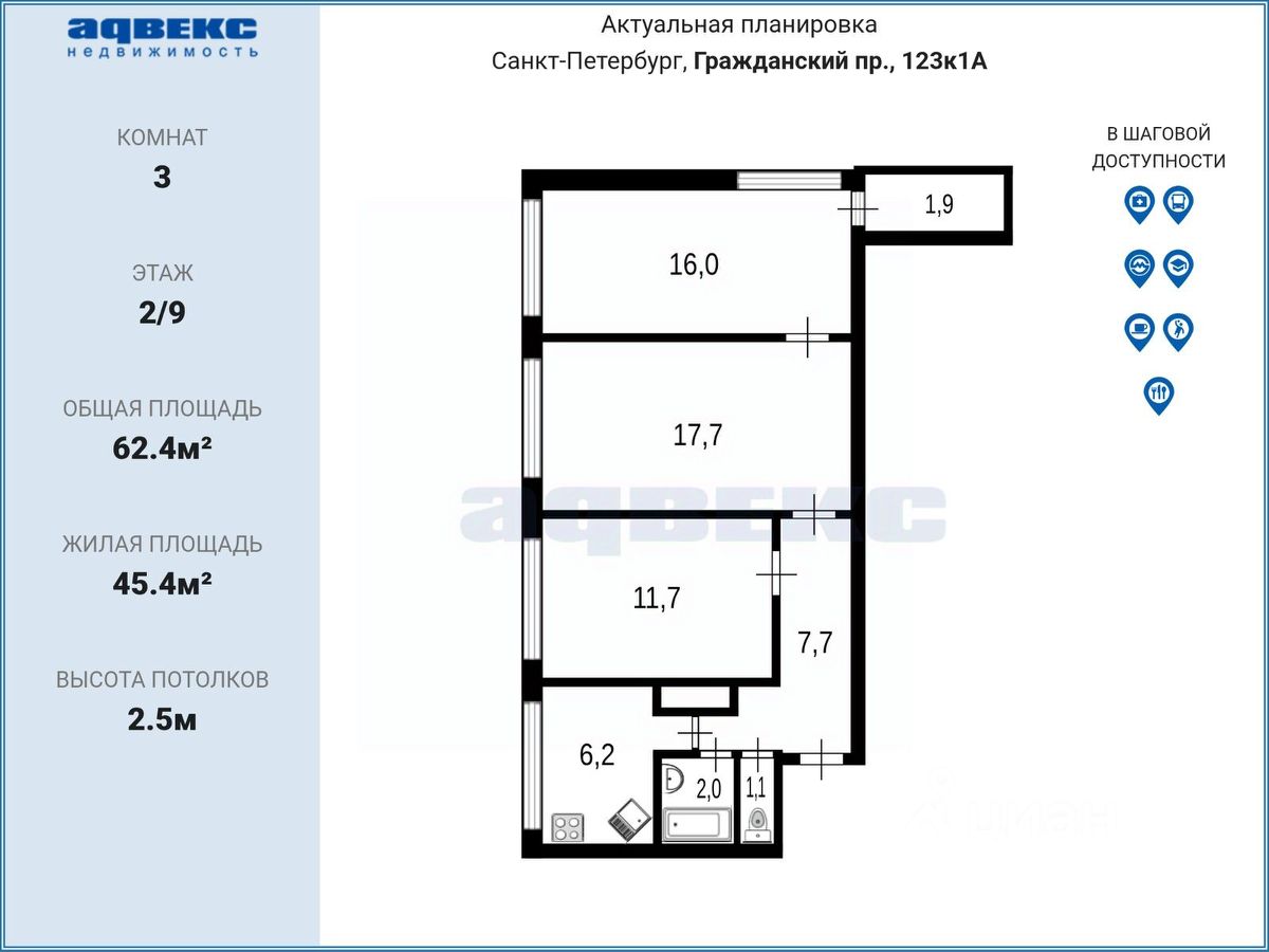 ID: 1915912 Уютная квартира с ремонтом , у метро Гражданский проспект ! В прямой продаже просторная 3-х комнатная квартира с мебелью и техникой. Ремонт выполнен для себя, из качественных материалов. Сделано все - выровнены полы, новая электропроводка с дополнительными розетками, стеклопакеты, натяжные потолки, радиаторы отопления, трубы в санузлах. Стены дополнительно утеплены. Квартира расположена на комфортном 2 этаже. Все окна выходят в тихий зеленый двор. Есть застекленная лоджия. Квартира в отличном состоянии. Вам не нужно ни о чем думать- просто заезжайте и живите с комфортом. - Дом расположен в благоустроенном районе с развитой инфраструктурой . Все в шаговой доступности. -Метро и остановки наземного транспорта в 5 минутах пешком. Недалеко ж/д станция. Удобно выезжать на дачу. -Во дворе детский сад, рядом школы, магазины, кафе, Т/Ц, медицинские учреждения, бассейн и все необходимое для жизни. - Муринский парк для прогулок и занятий спортом с детскими площадками для разных возрастов и велодорожками. -В 5 минутах выезд на КАД. По документам один взрослый собственник, без обременений, прямая продажа. Мы поможем организовать сделку и подобрать самые выгодные условия по ипотеке. Звоните и приходите на просмотры.