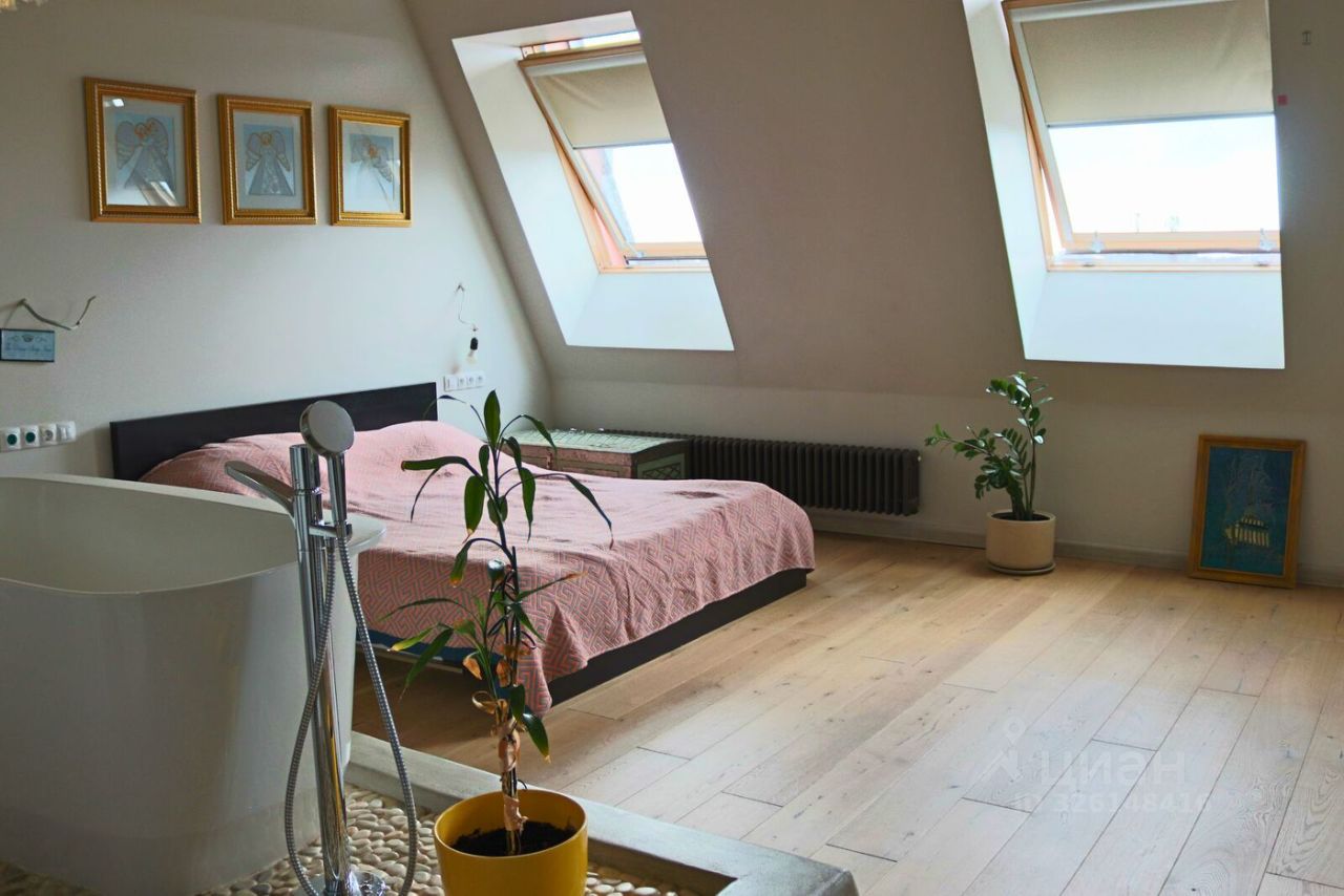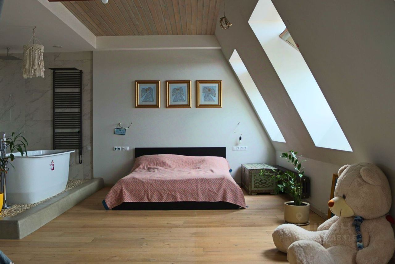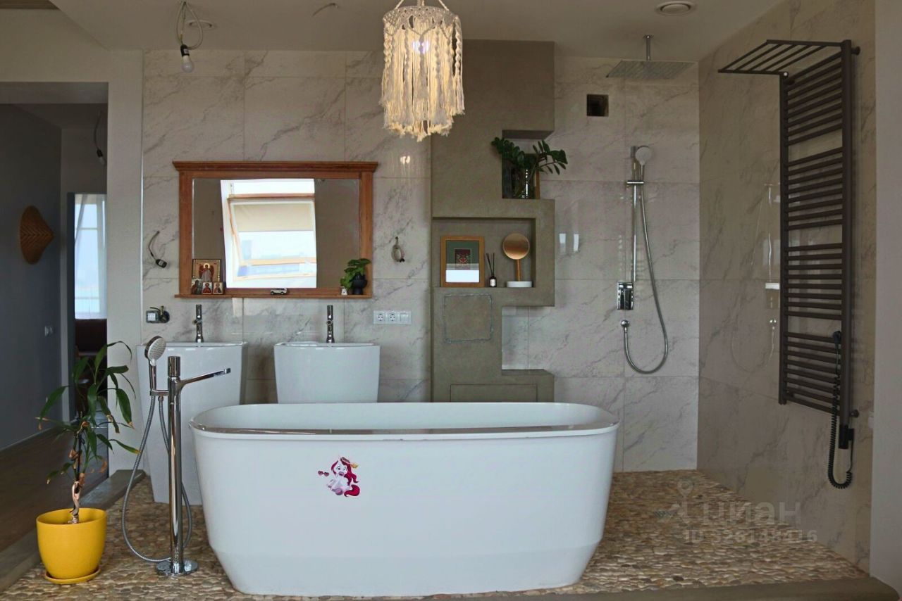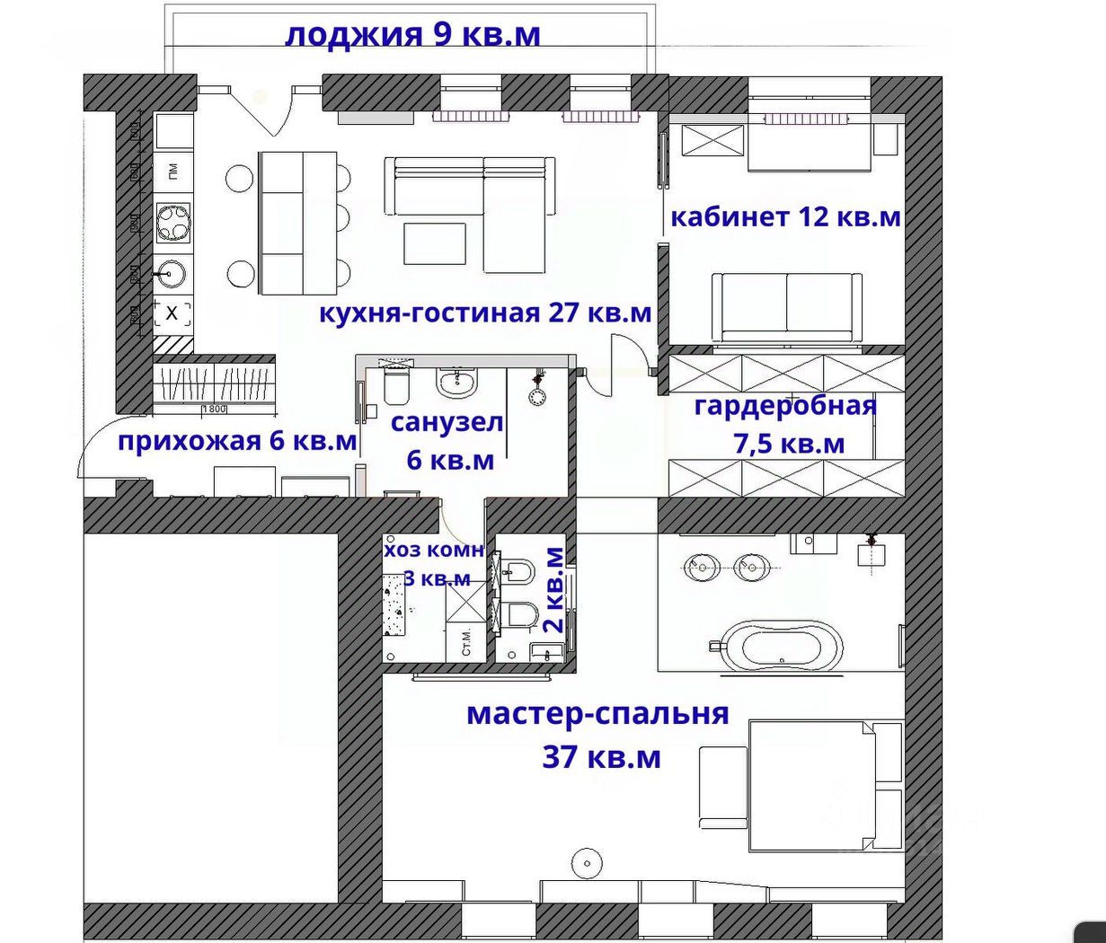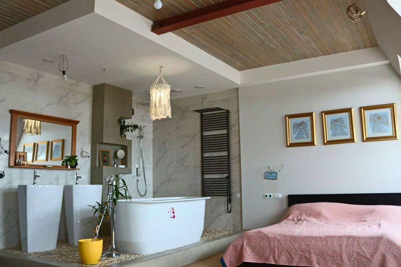 В квартире просторная кухня-гостиная площадью 27 кв.м с выходом на большую лоджию 9 кв.м, мастер-спальня площадью 37 кв.м с отдельной ванной и санузлом, кабинет 12 кв.м, большая оборудованная гардеробная 7,5 кв.м, второй просторный санузел 6 кв.м, хозяйственная комната 3 кв.м. Над квартирой технический этаж.