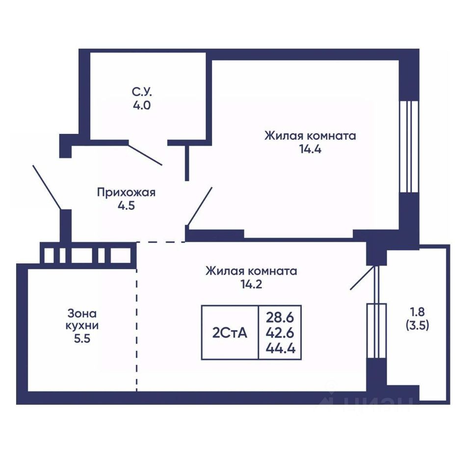 Общая площадь44,4 м2