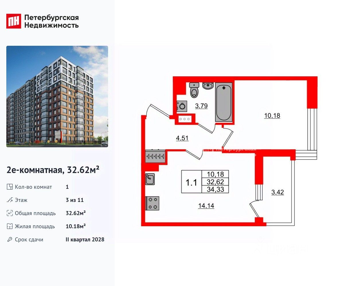 Удобная, классическая, функциональная европланировка, большая кухня-гостиная 14.14 м², просторная прихожая 4.51 м². Общая площадь квартиры - 32.62 м², жилая 10.18 м², высота потолка 2.77 м.