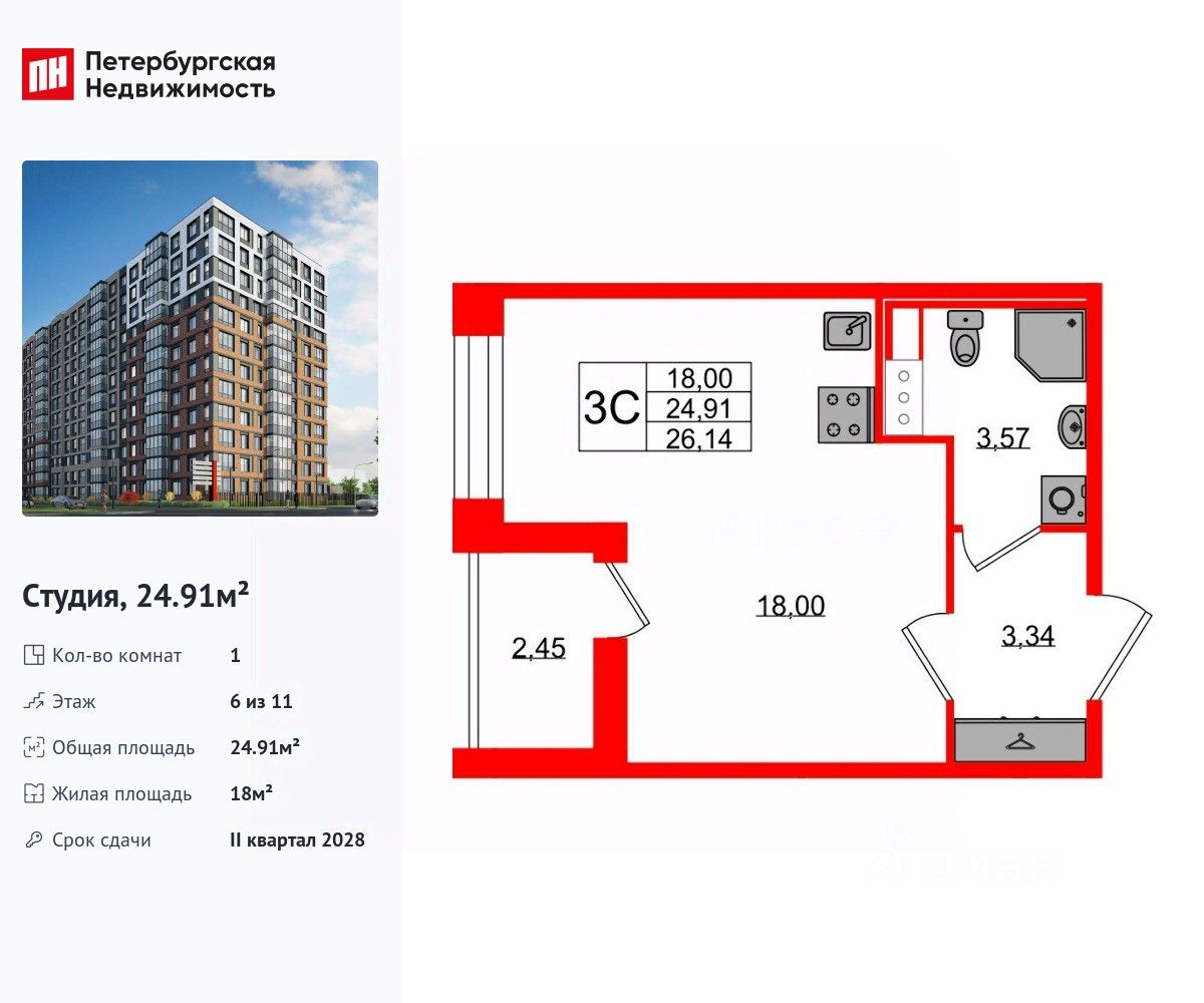 Удобная, классическая, функциональная европланировка, просторная прихожая 3.34 м². Общая площадь студии - 24.91 м², жилая 18 м², высота потолка 2.77 м.