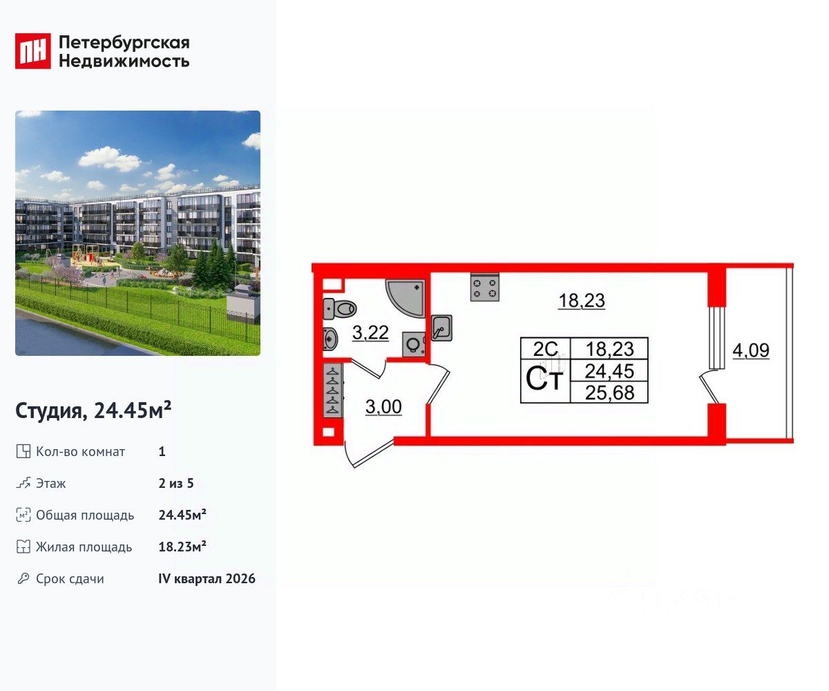 Удобная, классическая, функциональная европланировка, вместительная прихожая 3 м². Общая площадь студии - 24.45 м², жилая 18.23 м², высота потолка 2.77 м.