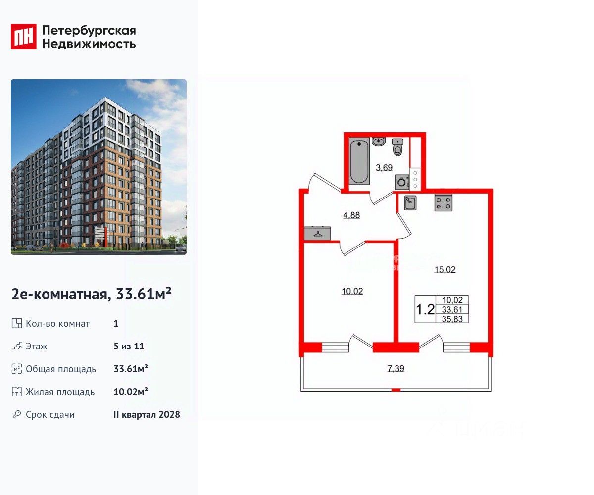 Удобная, классическая, функциональная европланировка, большая кухня-гостиная 15.02 м², просторная прихожая 4.88 м². Общая площадь квартиры - 33.61 м², жилая 10.02 м², высота потолка 2.77 м.