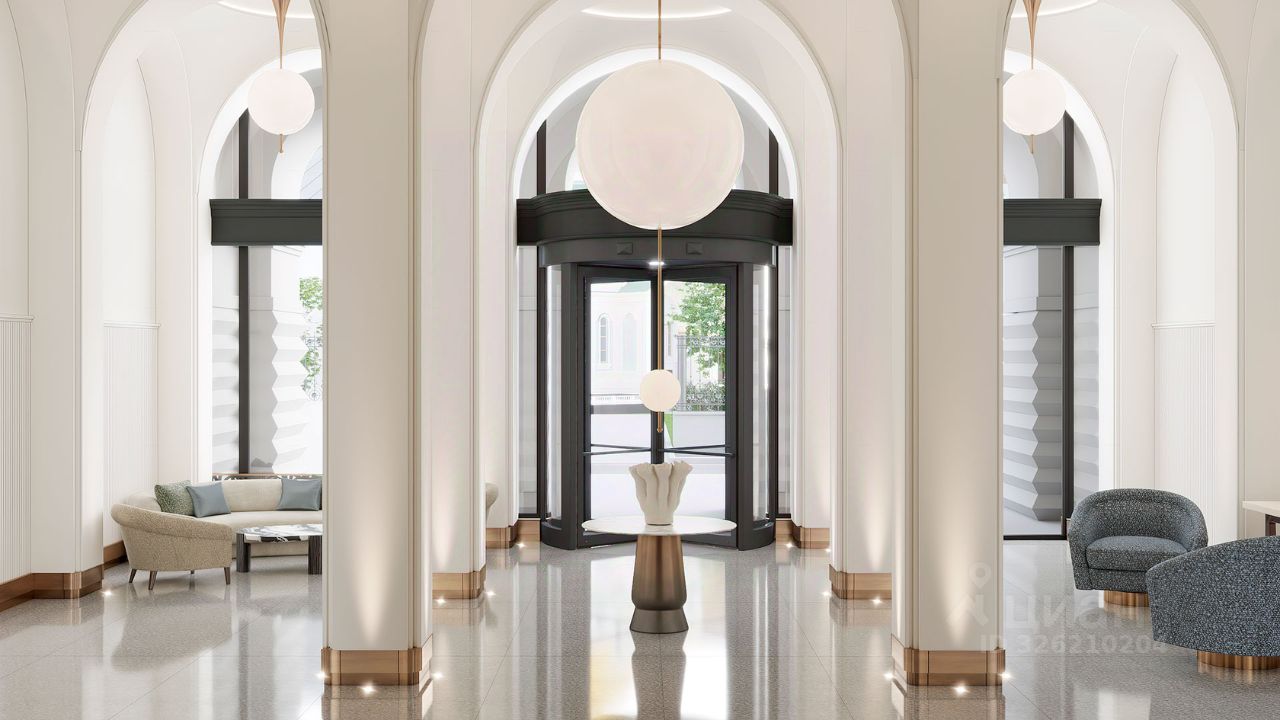 Камерная атмосфера создаётся за счёт деления на два корпуса и небольшого количества квартир в доме — их всего 263. Корпуса объединены триумфальной аркой, которая формирует закрытый контур внутреннего двора. Статус дома подчеркивают парадные холлы с арочными пролётами, витражным остеклением и произведениями искусства.