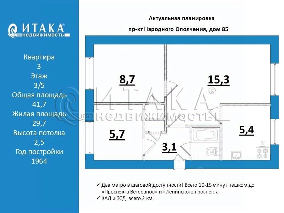 128979671 Продается 3-комнатная квартира на Народного Ополчения, 85 — ваш счастливый билет в отличный район! Главный козырь — безупречная локация: • Два метро в шаговой доступности! Всегоминут пешком до ''Проспекта Ветеранов'' и ''Ленинского проспекта''. Вы в центре транспортной инфраструктуры: легко добраться в любой конец города. • КАД и ЗСД всего 2 км. • Кировский район. Зелено, безопасно, развито. Всё необходимое — школы, поликлиники, магазины, ТРК .