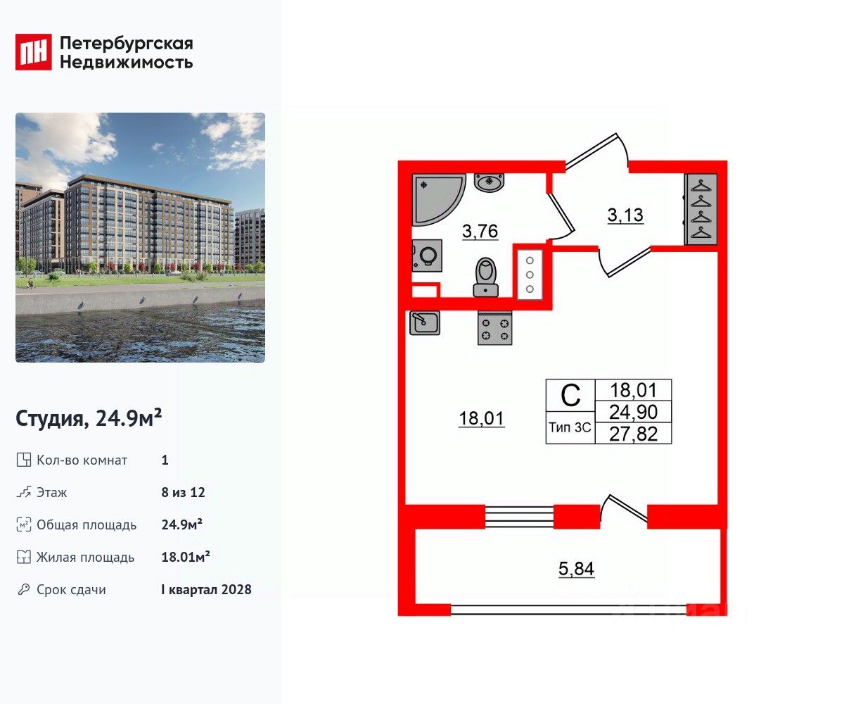 Удобная, классическая, функциональная европланировка, вместительная прихожая 3.13 м². Общая площадь студии - 24.9 м², жилая 18.01 м², высота потолка 2.77 м.