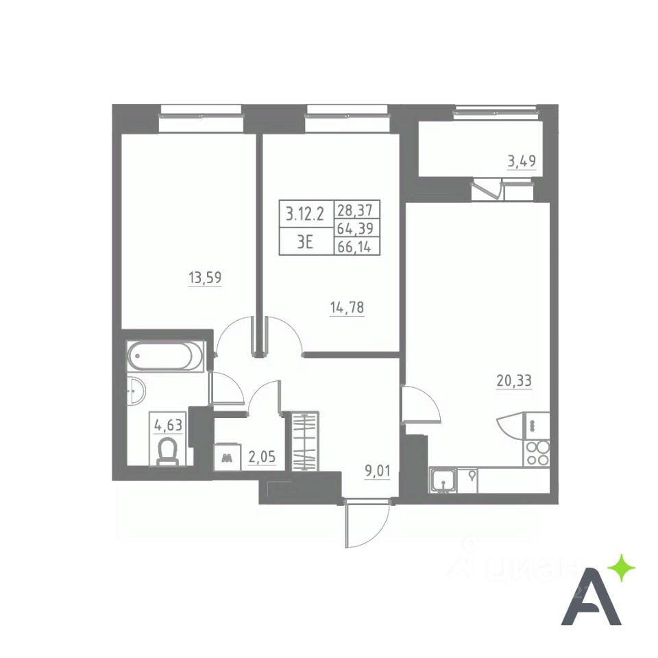 Общая площадь64,66 м2