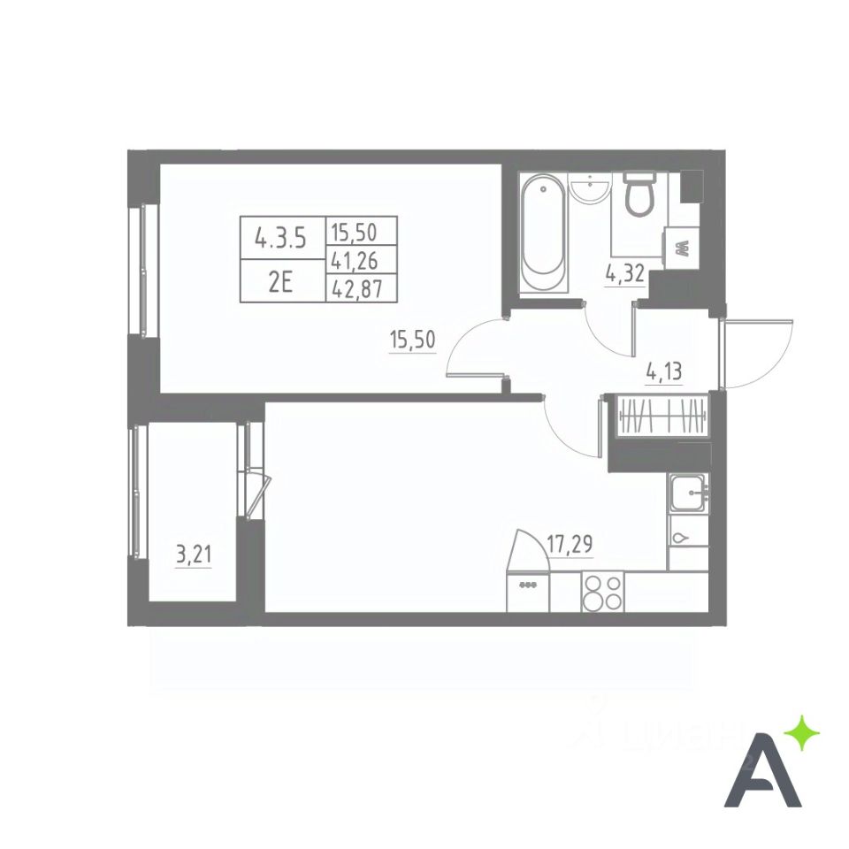 Общая площадь42,87 м2