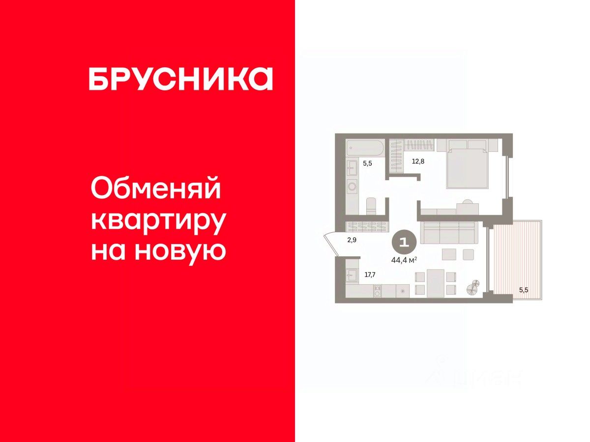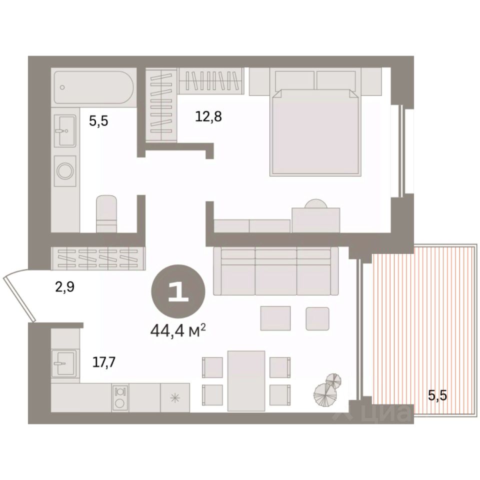 Квартира с кухней-гостиной и одной спальней в Южных кварталах. Особенности планировки: балкон, предчистовая отделка. квартиры в нашей базе: ЮК04-А1-9-9.19.5.