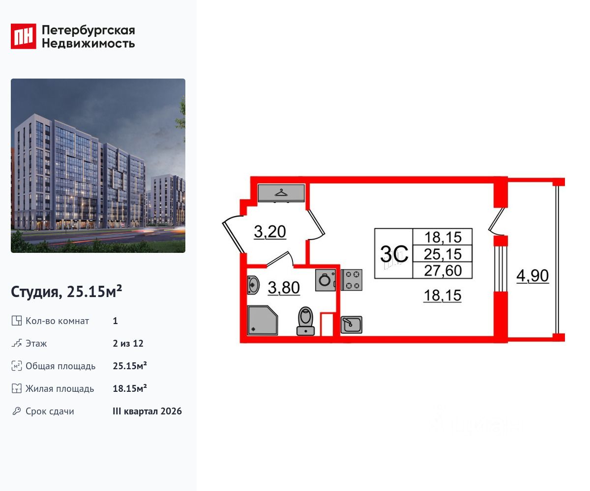 Удобная, классическая, функциональная европланировка, вместительная прихожая 3.2 м². Общая площадь студии - 25.15 м², жилая 18.15 м², высота потолка 2.77 м.