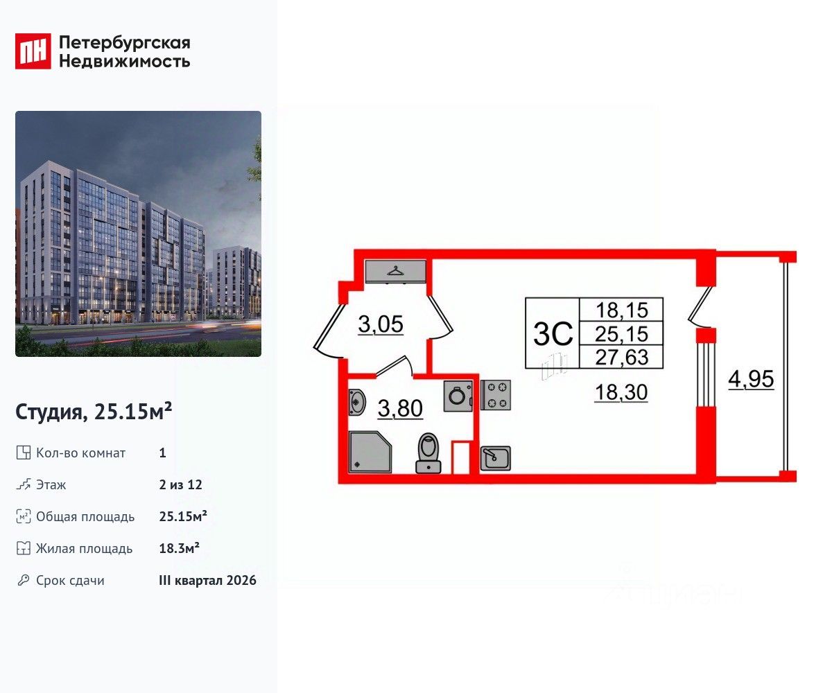 Удобная, классическая, функциональная европланировка, вместительная прихожая 3.05 м². Общая площадь студии - 25.15 м², жилая 18.3 м², высота потолка 2.77 м.