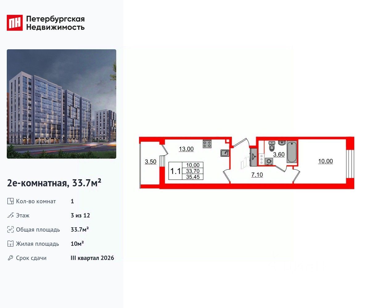 Удобная, классическая, функциональная европланировка, большая кухня-гостиная 13 м², просторная прихожая 7.1 м². Общая площадь квартиры - 33.7 м², жилая 10 м², высота потолка 2.77 м.