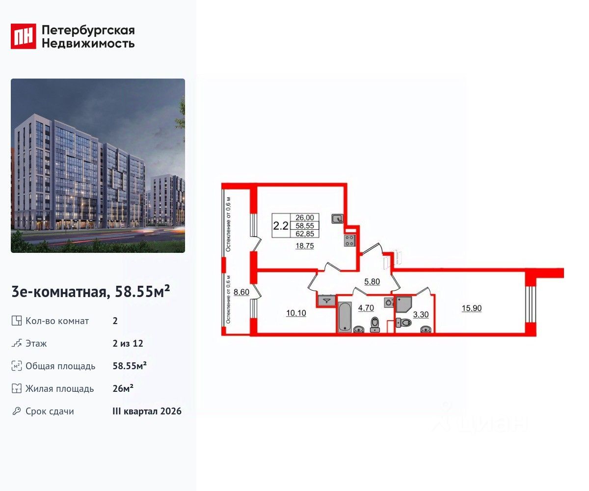 Удобная, классическая, функциональная европланировка, большая кухня-гостиная 18.75 м², вместительная прихожая 5.8 м². Общая площадь квартиры - 58.55 м², жилая 26 м², высота потолка 2.77 м.
