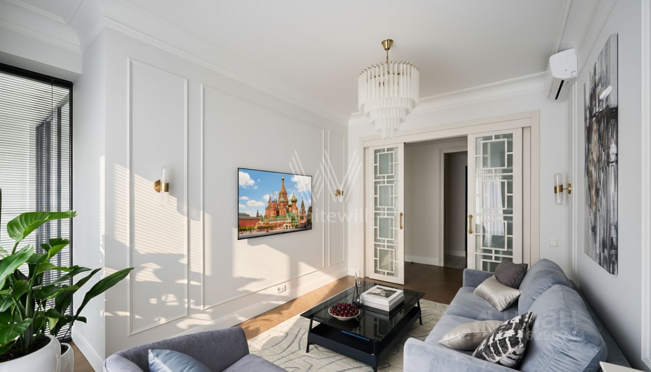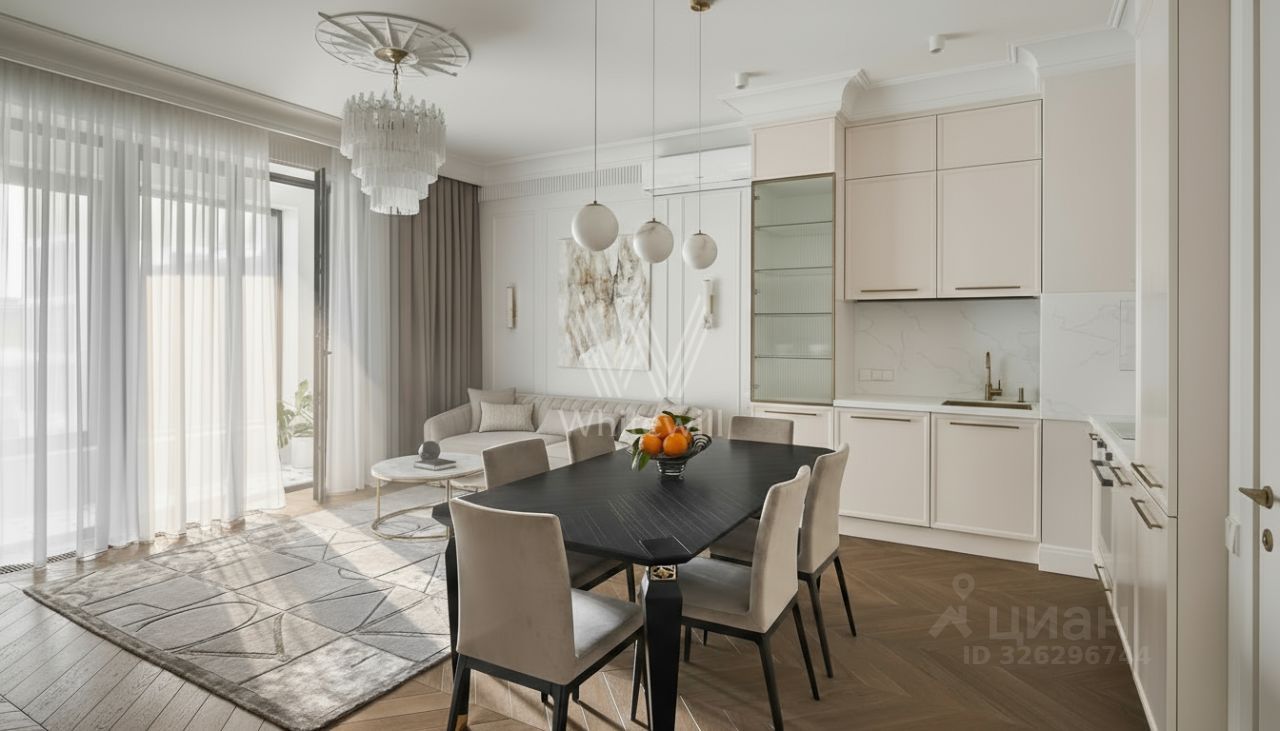 Квартира с двумя спальнями общей площадью 102 м² в комплексе клубных домов ''Садовые кварталы'' в Хамовниках. Квартира расположена на шестом этаже в корпусе 2.10, по карте Усачева д. 15А. Выполнена отделка по эксклюзивному проекту. Кухонный гарнитур и встроенные шкафы изготовлены по индивидуальному заказу из натурального дерева. Особое внимание уделено предметам декора, включая люстры, светильники, ковры и картины, которые способствуют созданию уютной и уникальной атмосферы. Квартира укомплектована итальянской и французской мебелью и техникой.