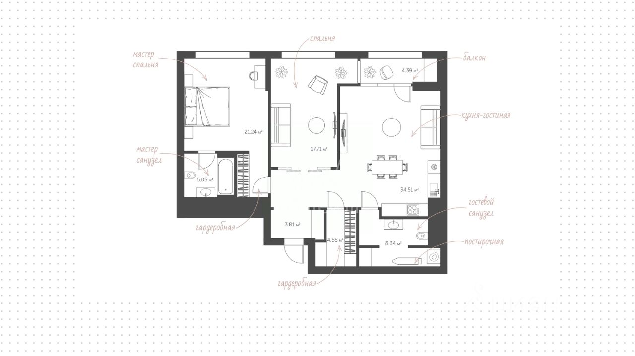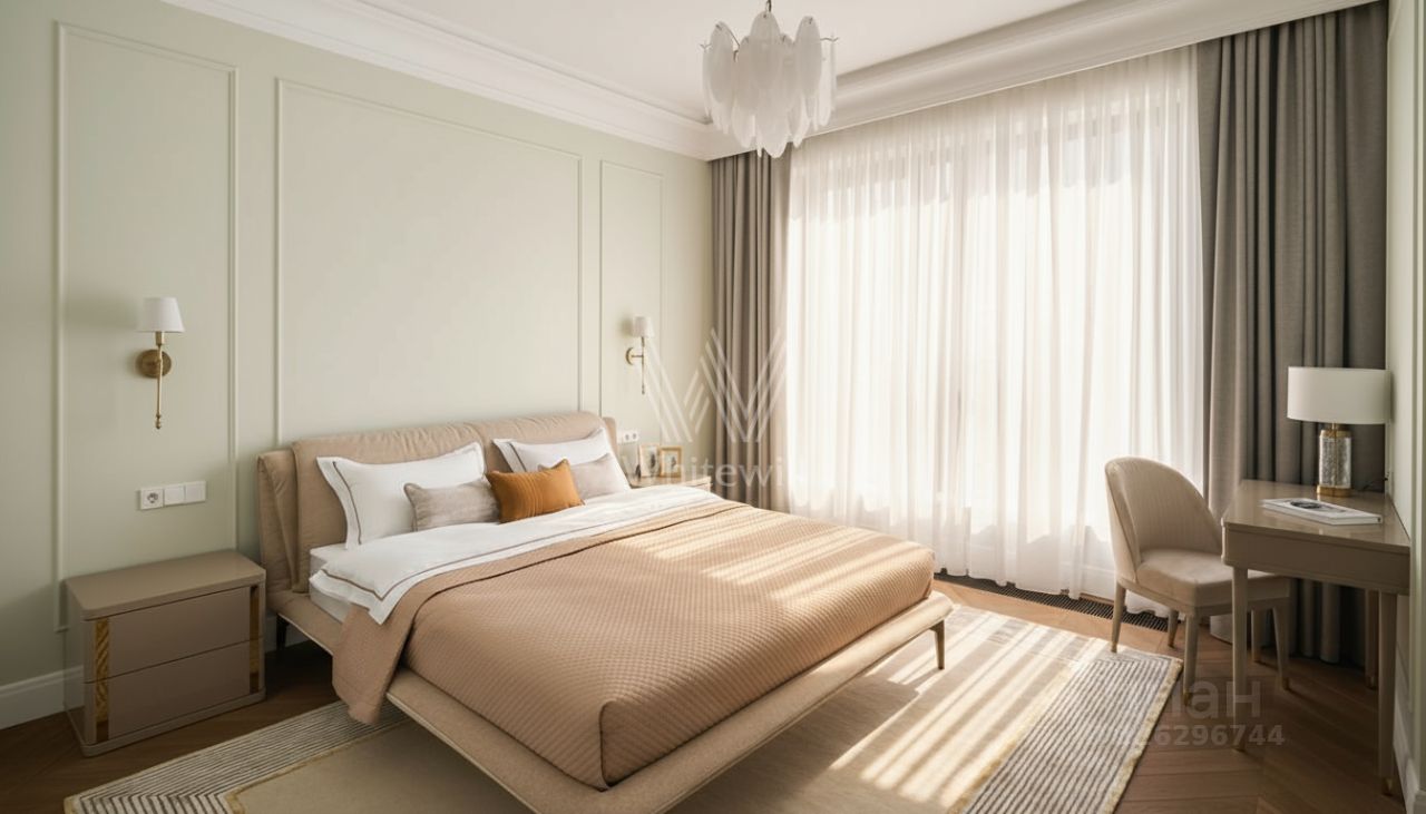 Планировкой предусмотрены кухня-гостиная с выходом на балкон, мастер-спальня с собственной ванной, гостевая комната, санузел с постирочной зоной, гардеробная, прихожая. Высота потолков - 3,10 м. Панорамные окна наполняют пространство естественным светом и теплом, открывая виды на благоустроенную территорию комплекса.