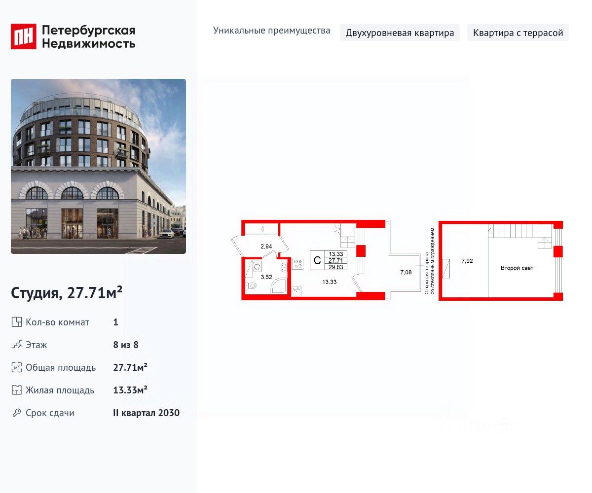 Уникальная, функциональная европланировка, вместительная прихожая 2.94 м². Общая площадь студии - 27.71 м², жилая 13.33 м².
