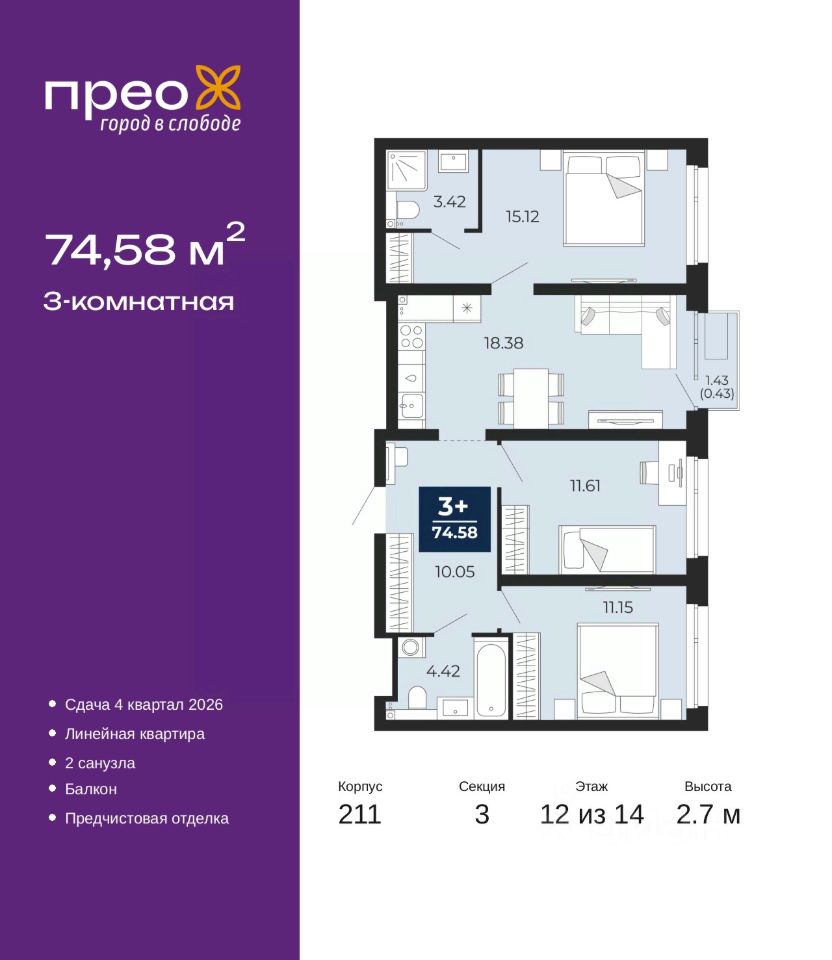 3-комн. квартира от застройщика с предчистовой отделкой в ЖК ''Прео'' на 12 этаже. Общая площадь: 74.58 кв.м., жилая: 37.88 кв.м., площадь просторной кухни-столовой: 18.38 кв.м. Комнаты изолированные, все окна выходят на одну сторону. В квартире один балкон, два совмещенных санузла. Высота потолков 2.7 м.