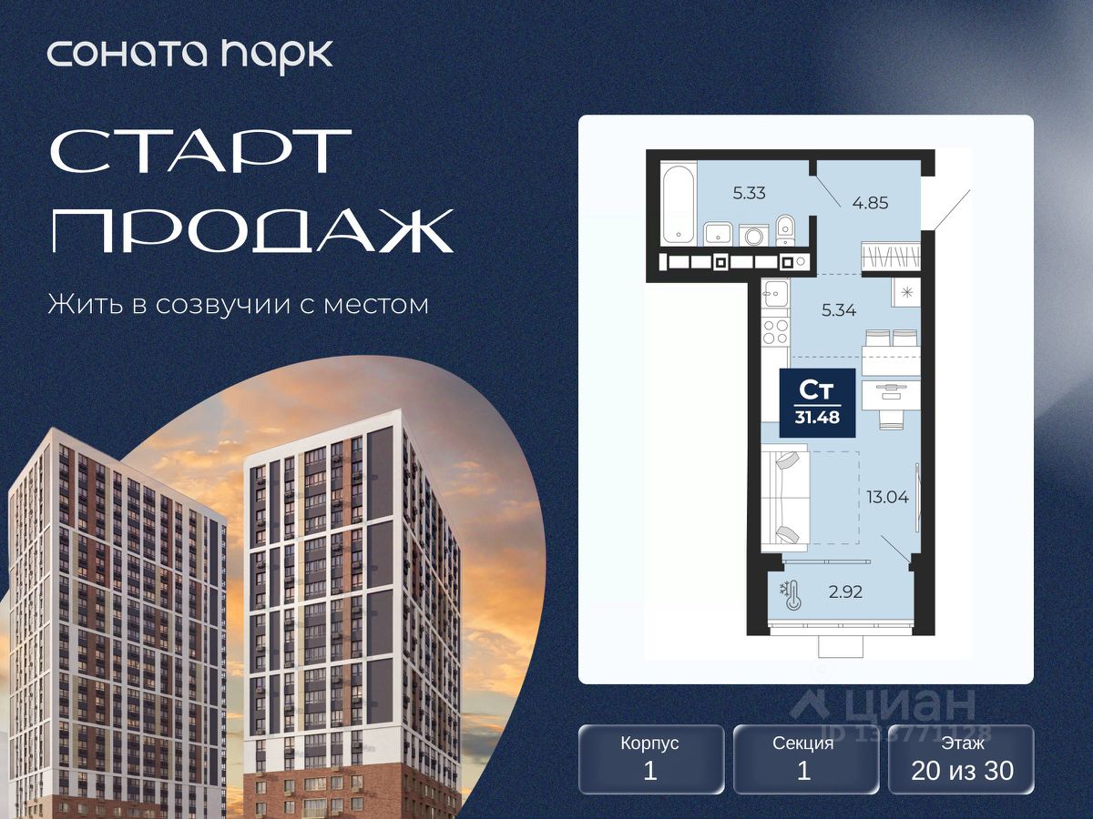 1-комн. квартира-студия с предчистовой отделкой в ЖК ''Соната Парк'' на 20 этаже. Общая площадь: 30.02 кв.м., площадь гостиной 18.38 кв.м., из которых 5.34 кв.м. выделено под кухонную зону. Все окна выходят на одну сторону. В квартире один балкон, один совмещенный санузел. Высота потолков 2.72 м.