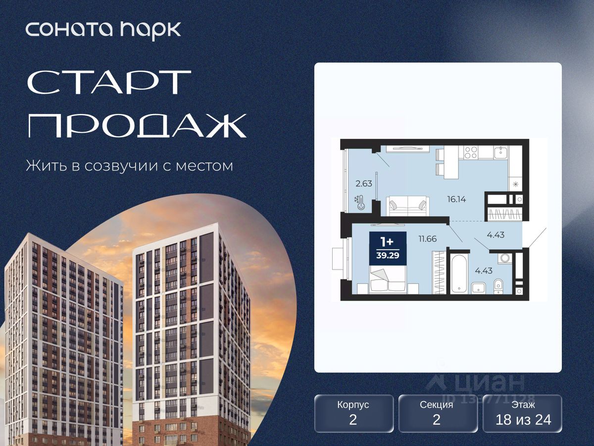 Продается однокомнатная квартира с предчистовой отделкой в ЖК ''Соната Парк'' на 18 этаже. Общая площадь: 37.98 кв.м., жилая: 11.66 кв.м., площадь просторной кухни-столовой: 16.14 кв.м. Все окна выходят на одну сторону. В квартире одна лоджия, один совмещенный санузел. Высота потолков 2.72 м.