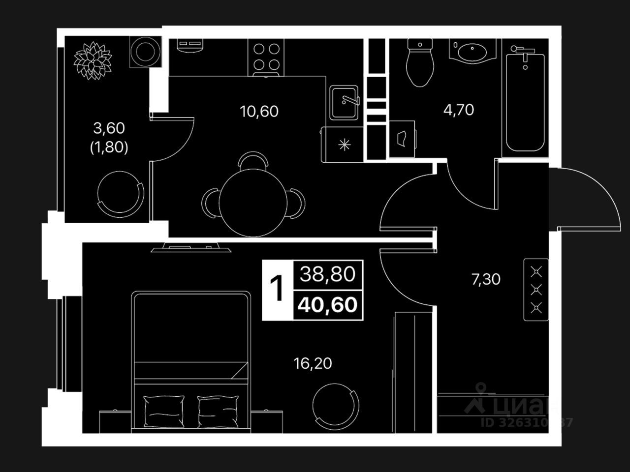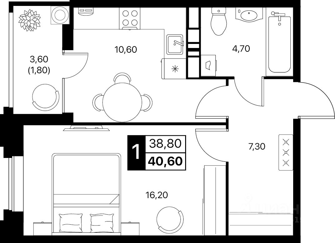 Общая площадь40,6 м2