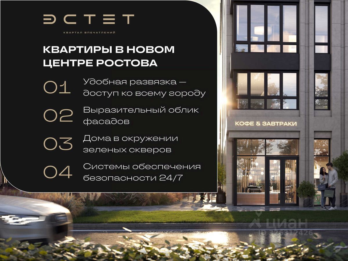 В ЖК Эстет: Безопасная закрытая территория с круглосуточной охраной Двор без машин Современное интеллектуальное освещение Детский сад и школа на территории Паркинг с лифтом до этажа Дизайнерские холлы Всё для активного отдыха, спорта и семейного досуга