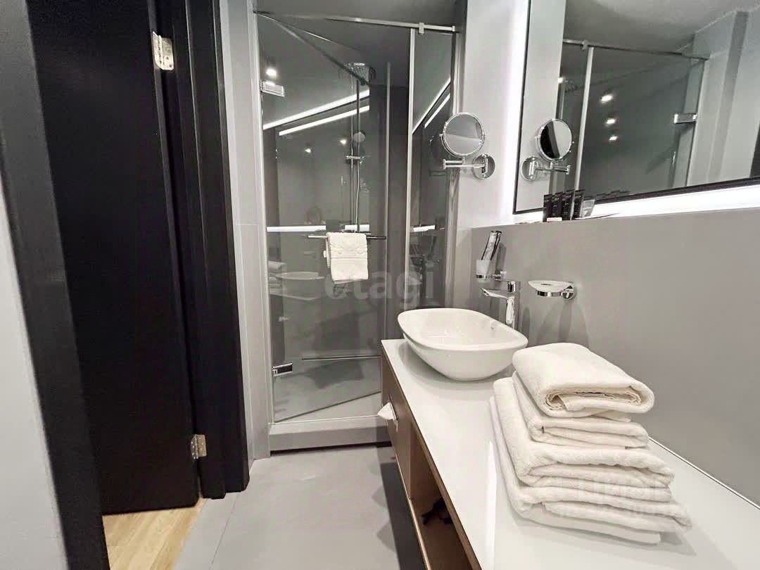 Апартамент передаётся с дизайнерским ремонтом, мебелью, техникой, посудой и текстилем. Всё соответствует высоким стандартам бренда Mercure. Вложений не требуется.