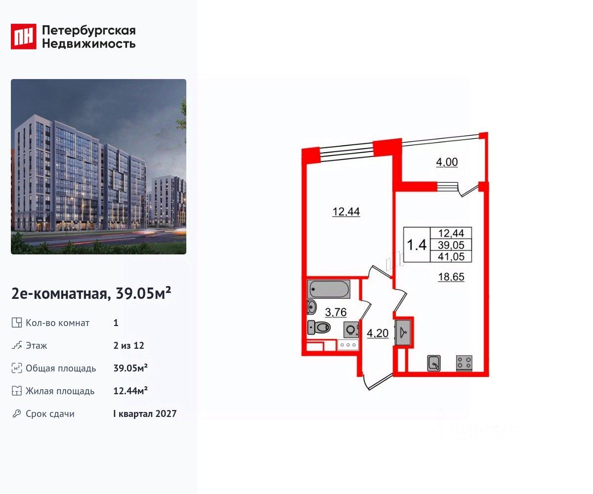 Удобная, классическая, функциональная европланировка, большая кухня-гостиная 18.65 м², просторная прихожая 4.2 м². Общая площадь квартиры - 39.05 м², жилая 12.44 м², высота потолка 2.77 м.