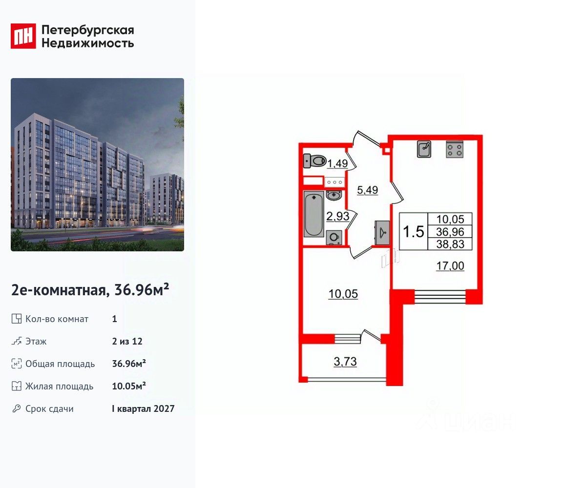 Удобная, классическая, функциональная европланировка, большая кухня-гостиная 17 м², просторная прихожая 5.49 м². Общая площадь квартиры - 36.96 м², жилая 10.05 м², высота потолка 2.77 м.