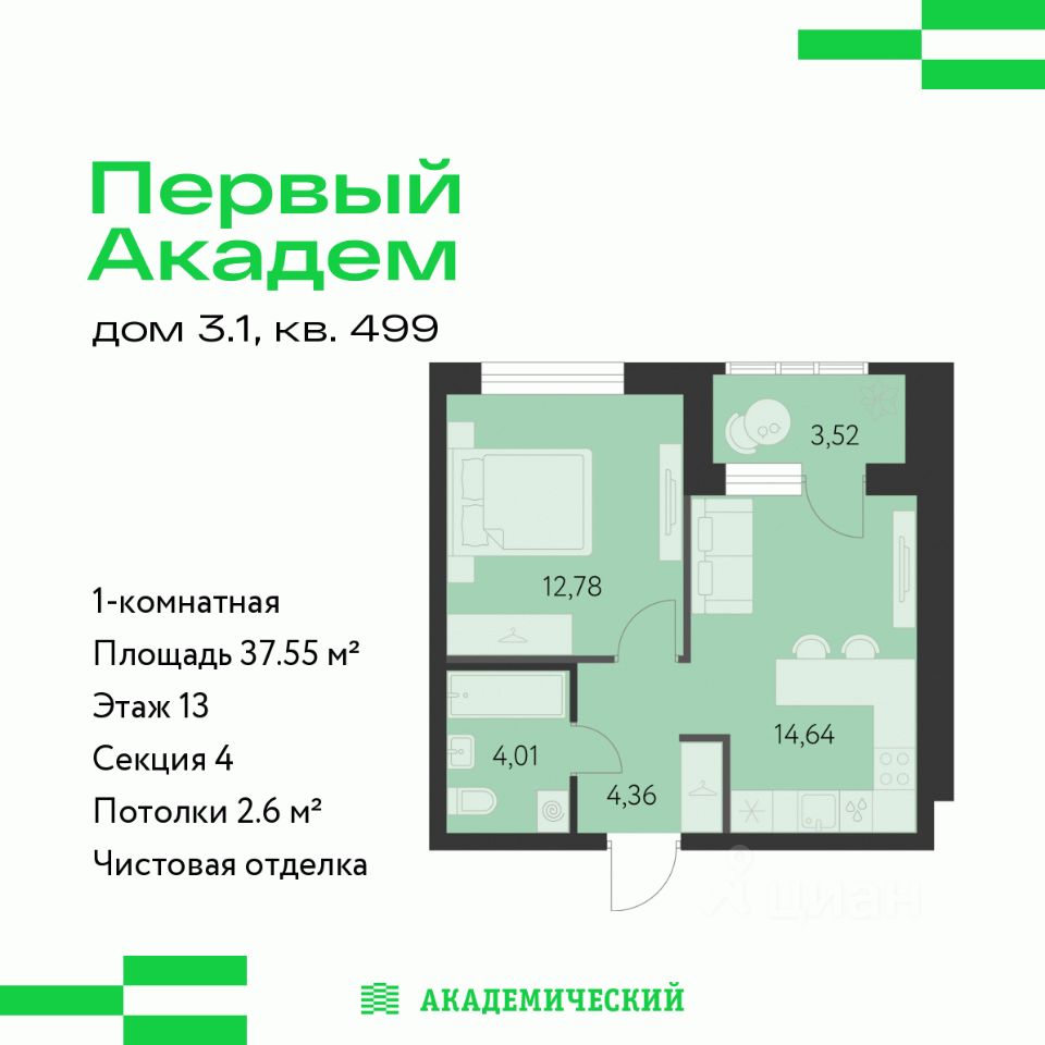 Продается 1-комнатная квартира площадью 37.55 кв.м. от девелопера ''Академический'' в жилом квартале ''Первый Академ''. Срок сдачи дома — 2 квартал 2028 года. Доступна субсидированная ипотека, выгодные условия и скидки напрямую от застройщика.