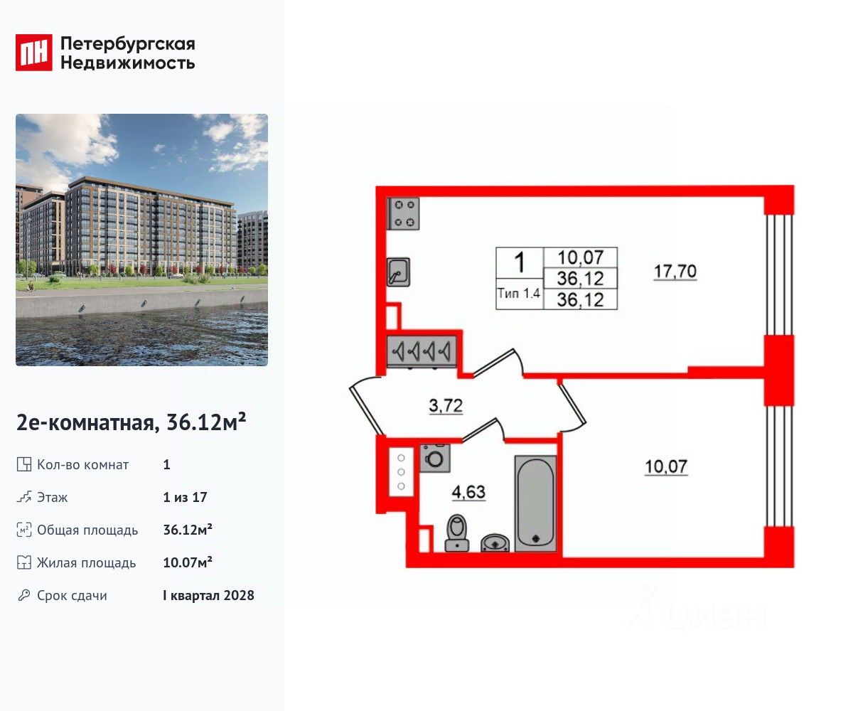 Удобная, классическая, функциональная европланировка, большая кухня-гостиная 17.7 м², вместительная прихожая 3.72 м². Общая площадь квартиры - 36.12 м², жилая 10.07 м², высота потолка 3 м.