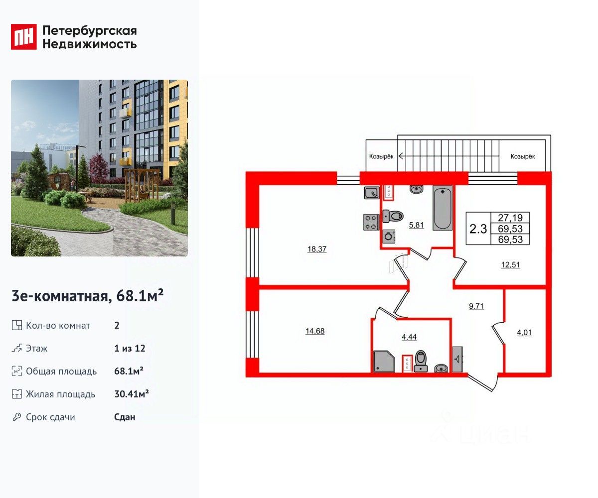 Удобная, классическая, функциональная европланировка, большая кухня-гостиная 11.9 м², просторная прихожая 10.07 м². Общая площадь квартиры - 68.1 м², жилая 30.41 м², высота потолка 2.77 м.