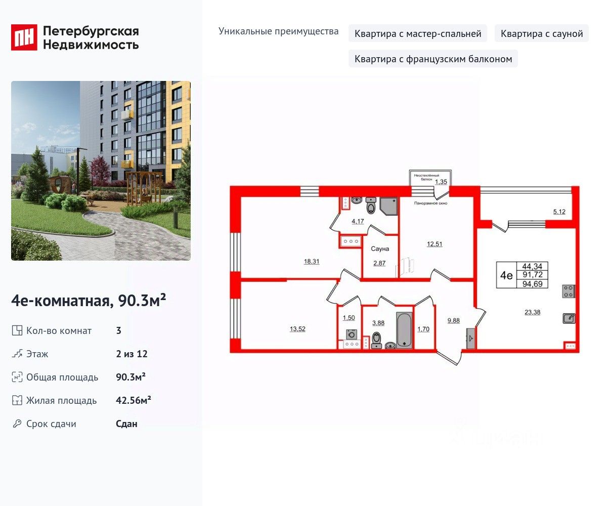 Уникальная, функциональная европланировка, большая кухня-гостиная 23.96 м², вместительная прихожая 9.88 м². Общая площадь квартиры - 90.3 м², жилая 42.56 м², высота потолка 2.77 м.