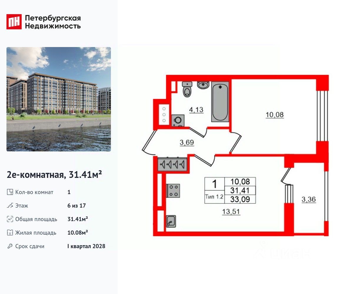 Удобная, классическая, функциональная европланировка, большая кухня-гостиная 13.51 м², вместительная прихожая 3.69 м². Общая площадь квартиры - 31.41 м², жилая 10.08 м², высота потолка 2.77 м.