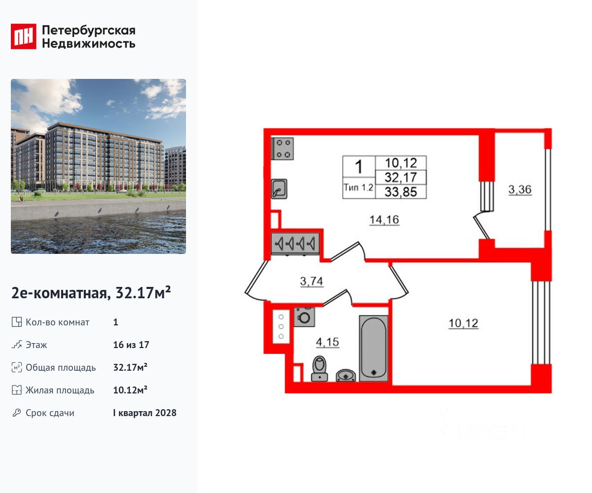 Удобная, классическая, функциональная европланировка, большая кухня-гостиная 14.16 м², вместительная прихожая 3.74 м². Общая площадь квартиры - 32.17 м², жилая 10.12 м², высота потолка 2.77 м.
